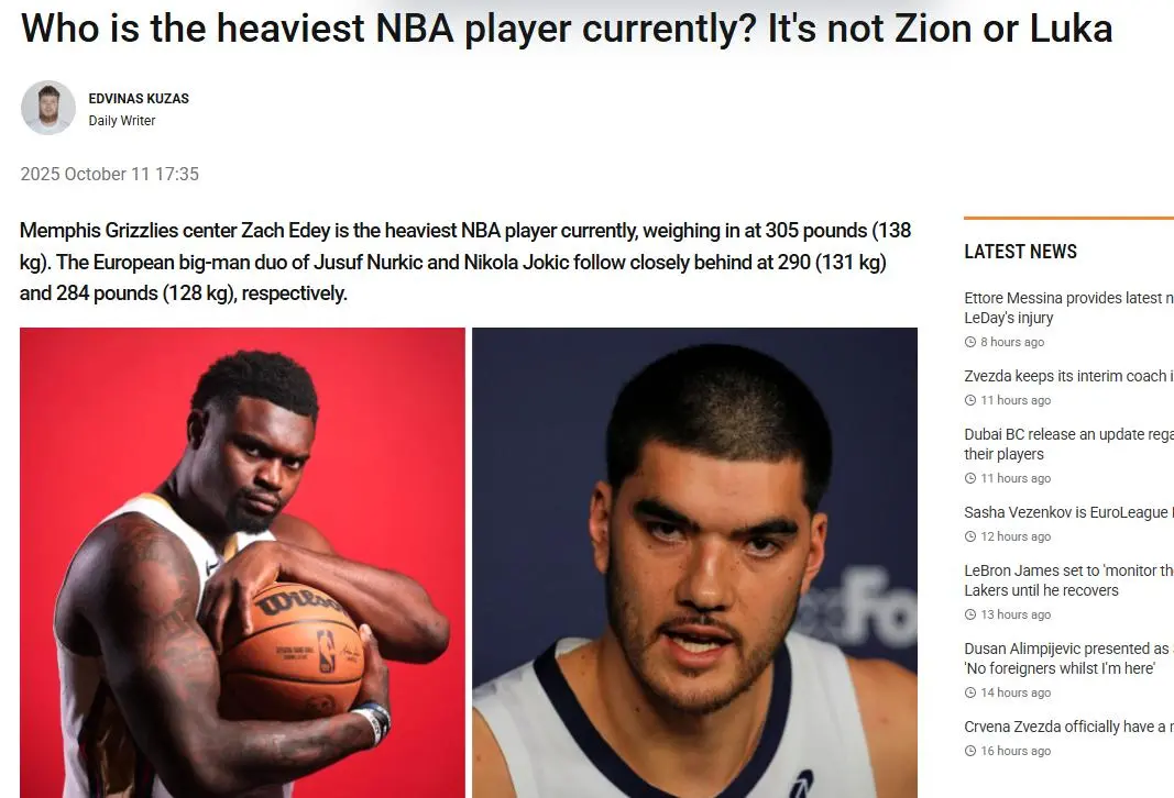 谁是NBA现役体重最大的球员?欧洲媒体BasketNews晒出TOP10名单龙信金融,其中杨瀚森122公斤排第九,第一名高达138公斤。