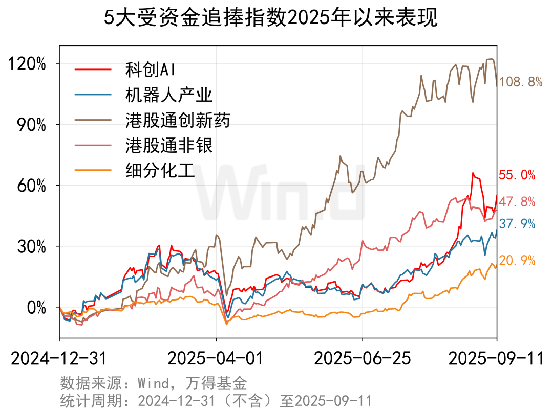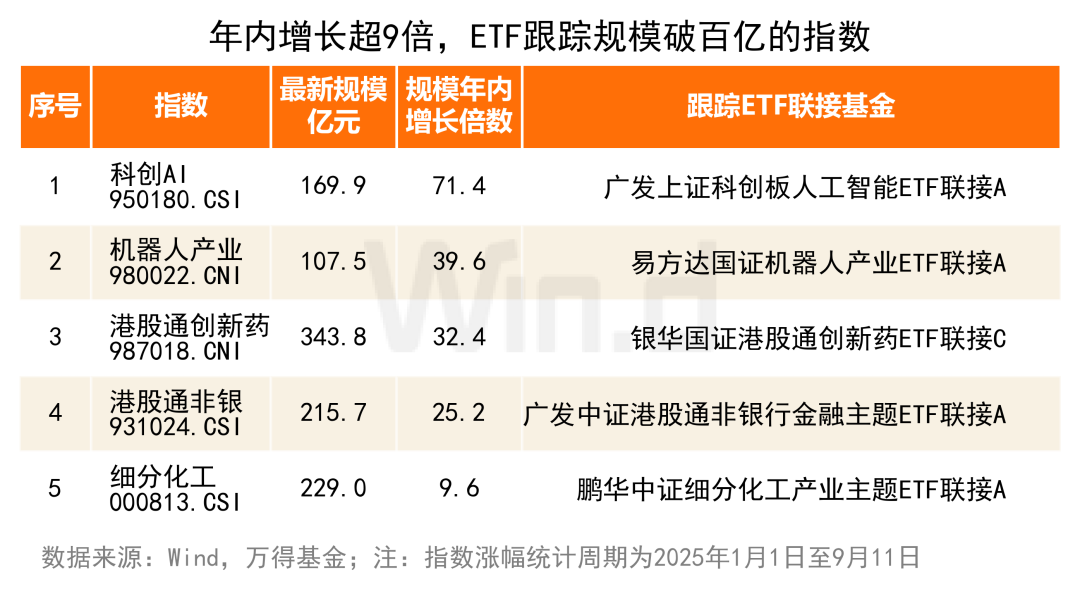 Wind数据显示,2025年9月11日与2024年底相比,有5只指数,其跟踪ETF的合计规模暴增超9倍,突破100亿元,成为今年以来增量资金明确的主攻方向。